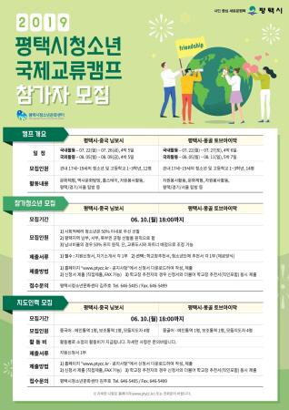 평택시는 평택시청소년문화센터와 2019년도 평택시 청소년국제교류캠프 참가자를 오는 10일까지 모집한다.