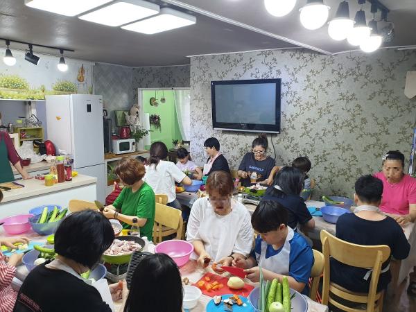 이번 교육은 안동찜닭과 오이부추깍두기를 실습하는 시간으로 아동이 연습용 조리도구로 재료를 직접 손질하고, 양육자는 아동과 함께 손질한 재료를 불을 사용해 조리해 양육자와 아동 간 소통과 협동심이 필요로 했다.