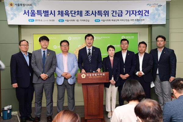 서울특별시의회 체육단체 비위근절을 위한 행정사무조사 특별위원회가 5일 오후 2시 서울특별시의회 본관 1층 기자회견실에서 긴급 기자회견을 열고, 서울시태권도협회의 의도적인 감사·조사권 침해 의혹을 제기하고, 성실하게 조사에 임해줄 것을 요청했다.