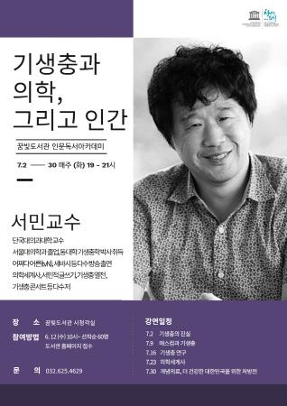 ‘기생충 열전’, ‘기생충 콘서트’, ‘서민적 글쓰기’ 등의 저자인 단국대 의과대학 서민 교수의 강의로 기생충의 진실과 의학세계사, 한국 의료 현실을 고찰하는 시간을 가질 예정이다.