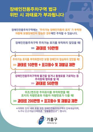 일반 차량이 해당 구역에 주차하면 10만원의 과태료 부과된다. 차량의 바퀴가 장애인전용주차구역에 침범만 해도 불법 주차로 간주된다.