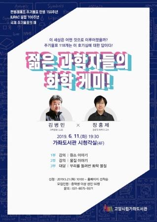 올해는 멘델레예프 주기율표 탄생 150주년, IUPAC 설립 100주년, 국제 주기율표의 해로, 가좌도서관에서 이를 기념하는 ‘젊은 과학자들의 화학 케미’가 진행된다. 이번 강연은 화학을 전공한 두 명의 젊은 과학자의 의미 있는 강연과 대담으로, 김병민 과학칼럼니스트와 장홍제 광운대 화학과 교수가 함께 한다.