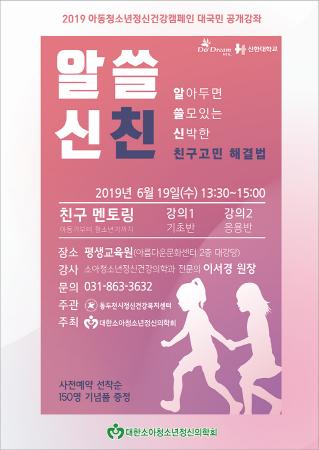 2019 아동청소년정신건강 캠페인 대국민 공개강좌 ‘알아두면 쓸모있는 신박한 친구고민 해결법’ 개최 안내