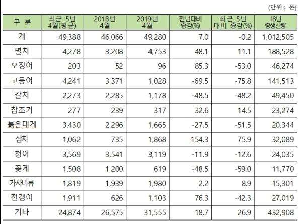 한편, 2019년 4월 연근해어업 생산금액은 전년에 비해 2.4% 감소한 2,765억 원으로 집계됐다.. 주요 어종별 생산금액은 삼치가 전년보다 179%, 멸치가 31% 증가한 반면, 꽃게는 31%, 갈치는 29% 각각 감소한 것으로 나타났다.