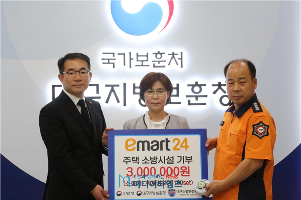 소방청(청장 정문호)은 이마트24(대표 김성영)와 호국보훈의 달을 맞아 국가유공자 주택에 소방시설을 지원하기로 업무협약을 맺고 4일 대구소방안전본부와 대구지방보훈청, 이마트24 관계인이 참석한 가운데 국가유공자 100가구분의 주택용 소방시설을 전달하는 행사를 가졌다.