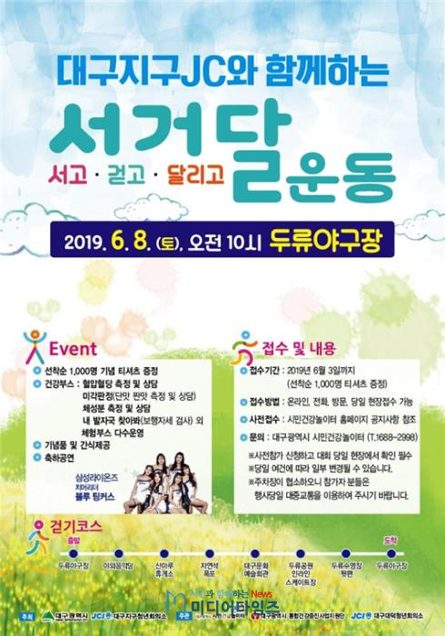 대구시는 8일(토) 오전 10시 두류공원 야구장에서 시민들의 걷기 실천 및 신체활동 증진을 위해 ‘대구지구청년회의소와 함께하는 서거달 운동’ 을 개최한다.