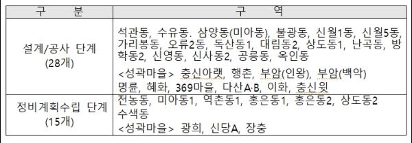 시는 6월 중 마을 기반시설 정비 공사를 시작하는 강북구 삼양동 소나무협동마을 관리형 주거환경개선사업 구역부터 시행한다는 계획이다. 이 구역의 정비기본계획수립과 실시설계가 완료된 상태로 사업초기부터 주민이 직접 주민워크숍 등에 참여해 지역주민들의 마을재생사업의 참여도가 높은 편이다.