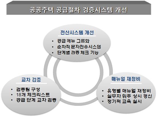 공사는 또한 팀장 1명과 실무자 2~3명으로 내부 검증팀을 구성해 공급 단계별로 교차검증을 실시한다. 검증팀은 공공주택 공고 전부터 서류심사대상자 선정 및 최종당첨자 결정까지 18개 체크리스트 항목을 기준으로 담당부서 점검 사항을 별도로 검증한다. 또 오류 검증뿐만 아니라 유형별 공급시스템 특성을 비교·분석해 통일된 시스템을 구현하도록 개선하는 역할도 담당한다.