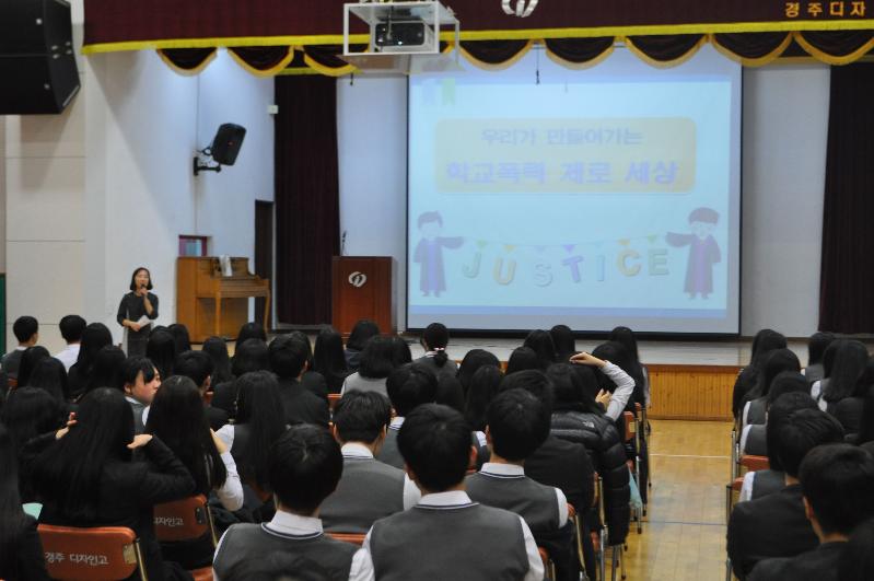 대구지방검찰청 경주지청 남지민 검사는 학교생활 속에서 쉽게 발생할 수 있는 다양한 사례와 급우 간에 지켜야 할 예절 등을 친근하게 설명해 주었다. 특히 학교폭력으로 인해 피해를 입은 한 학생의 예를 직접 들어, 가해학생이 보낸 문자를 비롯하여 당시의 상황을 제시하였고 그와 같은 유사한 상황이 발생할 때의 대처요령을 설명해 주었다. 또한 학교 폭력 예방을 위한 다양한 드라마 동영상을 보여주며 그 속에 담긴 학교 폭력의 실상을 보여주며 학교 폭력 예방의 중요성을 강조하였고, 학생들에게 “방관자도 가해자다”라는 인식을 가질 수 있는 시간이 되었다.