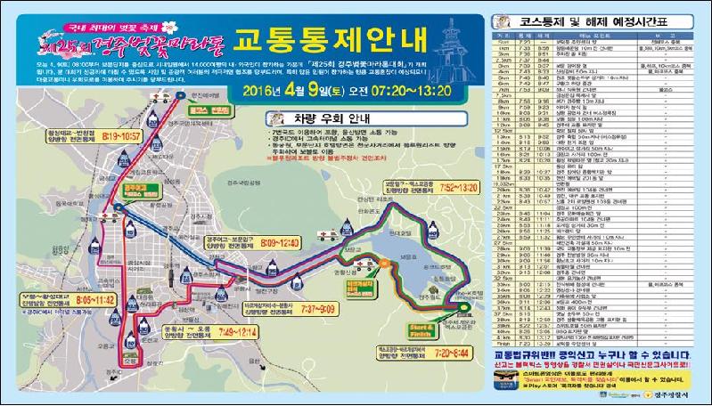 경주경찰서 배형철 교통관리계장은 “경주 벚꽃마라톤대회는 경주를 대표하는 큰 행사 중 하나로서 많은 인원이 참가하는 만큼 안전을 위한 교통통제는 불가피하다”, “ 다소 교통혼잡이 발생될 것으로 우려되지만 성숙한 경주시민은 대중교통이나 우회도로를 이용하여, 참가자들이 안전하게 마라톤을 완주할 수 있을 것이라 믿는다.”고 말했다.