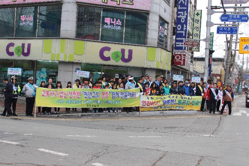 5일 오전 8시경 경주 건천장에서 오일장을 맞아 건천지역 시민들의 교통안전을 위한 캠페인을 실시했다. 이날 진행된 교통안전캠페인에는 경주서장 외 경주경찰서 경찰관 및 경주시장을 비롯한 경주시청 직원, 교통안전공단, 건천읍사무소, 녹색어머니회, 모범운전자 경주지부, 건천지역농협, 건천지역 자율방범대, 생활안전협의회, 건천초등학교 학생 등 10여개 기관 약 250여명이 참석하였다. 봄을 맞아 건천오일장을 찾은 건천시민들을 대상으로 전단지, 장바구니 등 홍보물품을 함께 배포하며, △무단횡단 금지 △보행자 보도통행 △교통신호 준수 △과속․난폭운전 금지 등 교통법규 준수 및 교통사고 예방을 홍보했다.