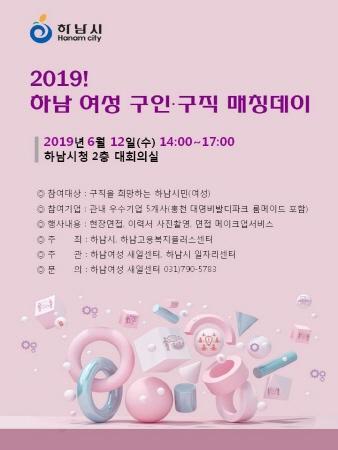 하남시는 오는 12일 시청 대회의실에서 ‘2019 하남여성 구인·구직 매칭데이’를 개최해 하남여성 일자리 창출에 적극 나선다고 밝혔다.