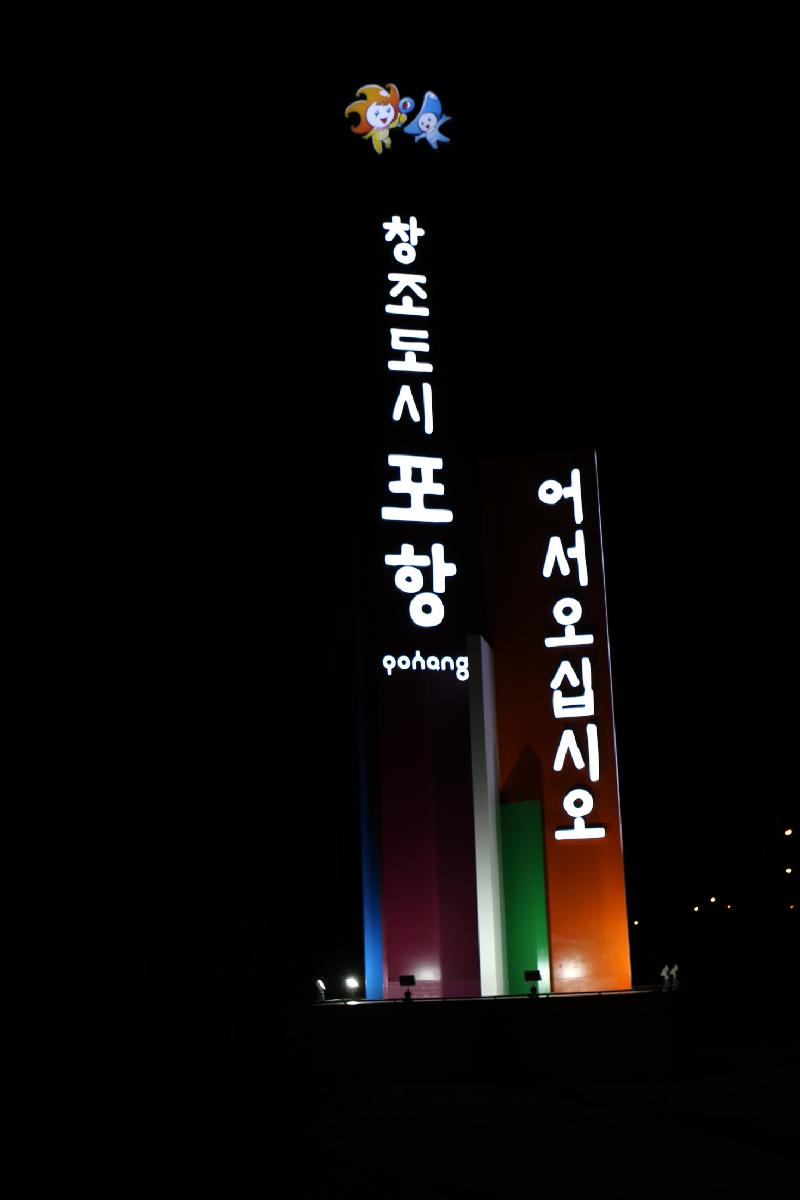 포항시가 남구 연일읍 유강리 소재 7번국도인 유강터널 앞 상·하행도로 사이의 녹지대 상에 포항을 찾는 관광객 맞이를 위한 조형물을 설치하고 4일 준공했다. 푸른 바다와 철의 도시를 상징하는 이번 조형물은 높이 15m, 폭 3.8m로 제작됐으며, 경주에서 포항 방향의 도로에는 “창조도시 포항, 어서오십시오”가, 포항에서 경주 방향의 도로에는 “창조도시 포항, 안녕히 가십시오”라는 인사말이 표현되어 있다. 특히 조형물 측면 등에는 LED 조명을 설치해 야간에 포항을 찾는 관광객에게 최대한의 시인성을 주도록 했으며, 조형물 하부에서 8개의 투광기로 조형물을 비춰 아름다운 야간경관이 연출되도록 조성됐다. 한편, 시 도시건설사업소 관계자는 이번 조형물 설치로 다가오는 여름 휴가철 불빛축제와 해수욕장을 찾는 관광객들에게 포항시의 이미지 개선 및 홍보 효과에 기여할 것으로 기대하고 있다고 밝혔다.