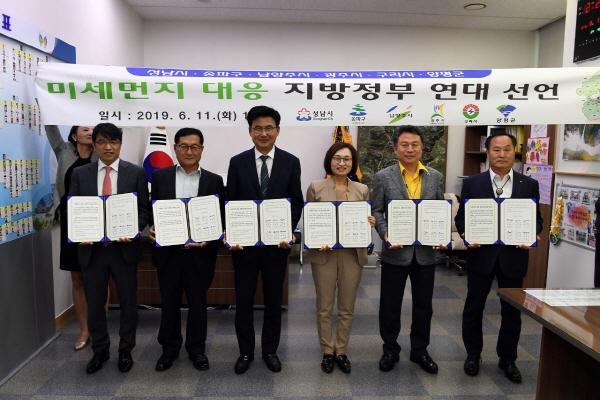 남양주시, 성남시, 송파구, 광주시, 구리시, 양평군은 11일 성남시청 시장 집무실에서 개최된 ‘미세먼지 대응 지방정부연대 선언식’에서 미세먼지 문제를 해결하기 위해 모든 역량을 결집해 공동으로 노력하기로 선언했다.