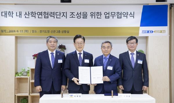 이재명 경기도지사는 11일 오후 도청 상황실에서 김우승 한양대학교 총장, 송한준 경기도의회 의장, 전해철 국회의원 등이 함께한 가운데 이런 내용을 담은 ‘대학 내 산학연협력단지 조성을 위한 업무협약’을 체결했다.