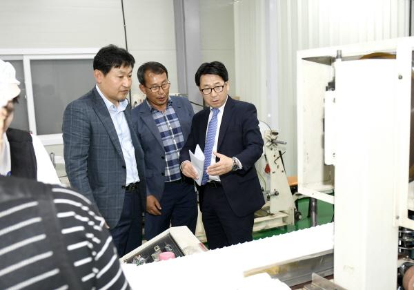 간담회는 회사현황 청취 후 기업애로 면담 및 제품 생산라인 견학 등으로 진행됐다. ㈜씨엘블루는 16명이 근무하고 있으며 물티슈를 제조하는 업체로 휴대용 물티슈 판매량은 업계 1위를 차지할 정도로 꾸준한 매출 성장세에 있으나 지하수를 사용해 성수기 시 물부족 현상을 겪게 돼 상수도 설치를 건의했다.