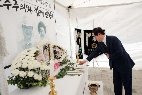 안병용 의정부시장은 12일 ‘의정부 역전근린공원’ 앞에 설치된 고 김대중 前 대통령 부인 이희호 여사 분향소를 찾아 조문했다.