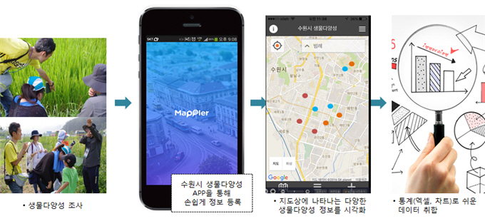 생물다양성에 관심 있는 시민과 환경단체들이 직접 모니터링하고 이를 지도 위에 시각화 할 수 있도록 도와주며 공유할 수 있는 시스템으로 수원시에서 운영하는 모니터링, 교육 사업 추진 시 활용할 예정이다.