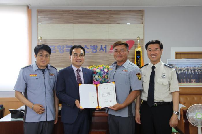 황흥섭 대원은 지난 5월 19일 18:12경 포항시 북구 청하면 방파제에서 바다로 추락한 승용차 운전자(여, 36세)를 구조하여 LG복지재단의 “LG의인상”수상자로 선정되었다.
