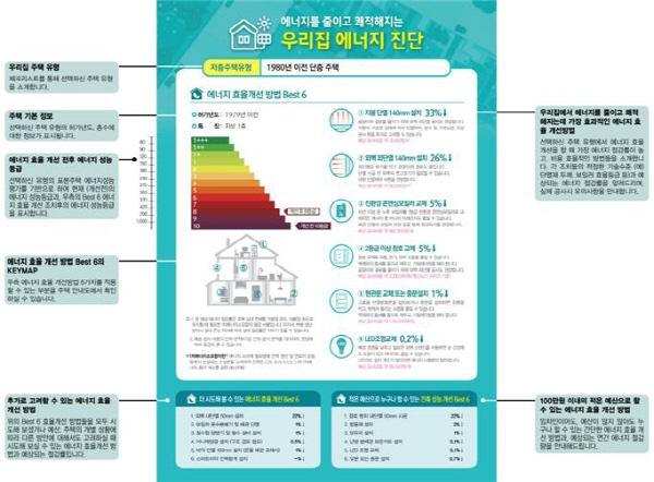 진단보고서엔 이밖에도 에너지 개선 전후 예상 에너지 성능 등급·효율, 개선효과, 에너지 절감율, ‘더 시도해볼 수 있는 에너지 효율 개선 Best 6’, 임차 가구를 위한 ‘적은 예산으로 할 수 있는 건축 성능개선 Best 6’ 등의 정보도 함께 제공된다.