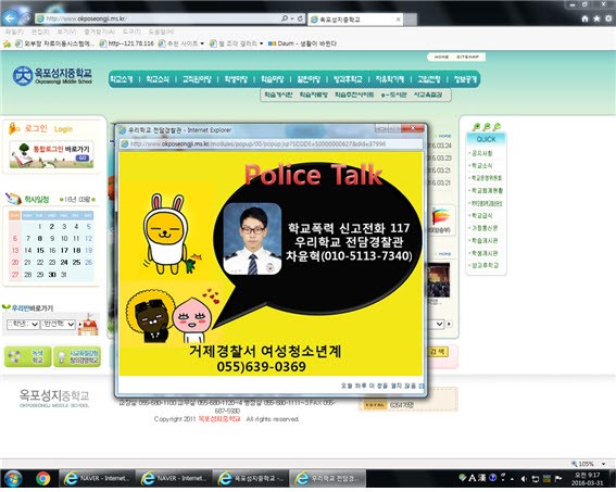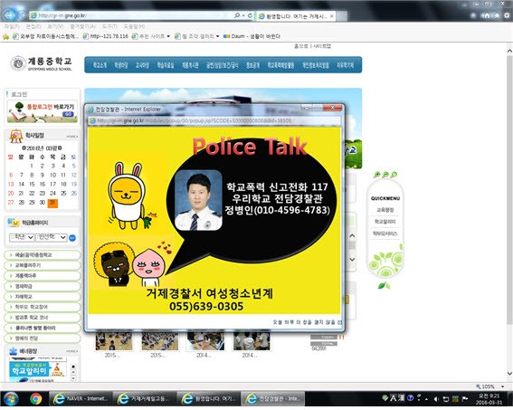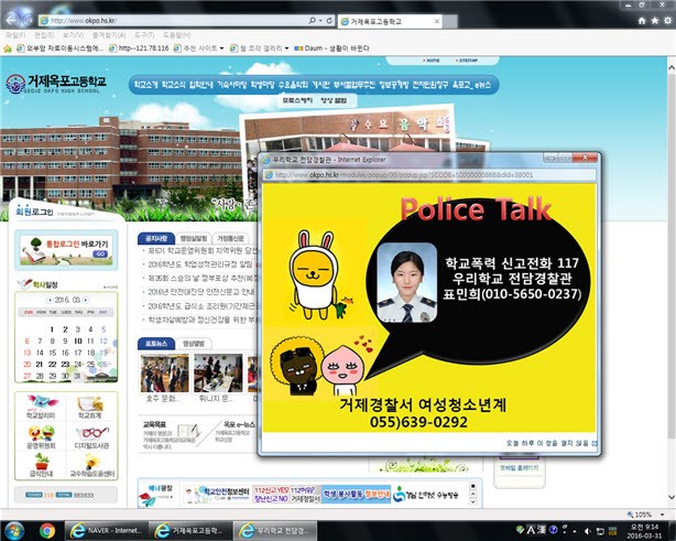 거제경찰서(서장 김영일)에서는 새 학기 초 빈번히 발생하는 학교폭력 등 청소년 범죄의 발생을 예방하고 피해학생들의 적극적인 신고를 위해 관내 전 초·중·고 학교홈페이지에 학교전담경찰관을 홍보하는 팝업창을 제작하여 홍보했다.