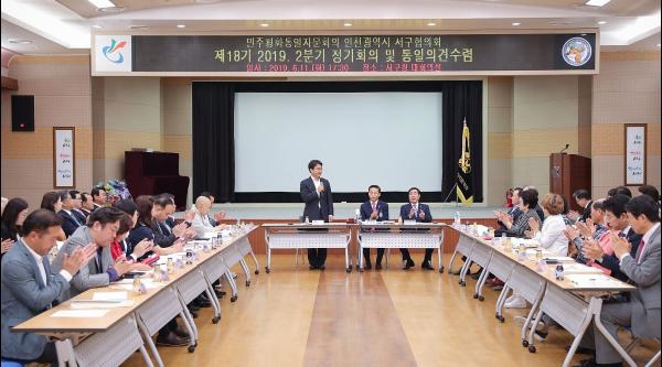 민주평화통일자문회의 인천광역시서구협의회는 지난 11일 서구청 지하 대회의실에서 자문위원과 이재현 서구청장 등 50명이 참석한 가운데 ‘제18기 2019년 2분기 정기회의 및 통일의견수렴’을 개최했다.