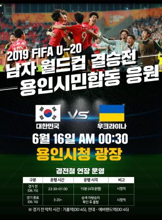 한국 남자축구 역사상 최초로 FIFA 주관 대회 결승에 오른 U-20 월드컵 대표팀의 우승을 기원하는 용인시민 합동 응원전이 오는 16일 0시 30분 용인시청 광장서 펼쳐진다.