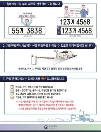 인천시는 오는 9월 1일부터 시행되는 비사업용 승용차의 번호체계 변경과 관련해 공공기관 및 민간주차장, 쇼핑몰, 아파트 등에 있는 차량번호 인식시스템이 신규 번호판을 인식할 수 있도록 사전 업데이트가 필요하다고 밝혔다.