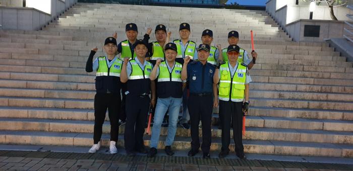 | 시청앞에서 도보 순찰을 위해 회이팅을 외치고 <미디어 타임즈> |
