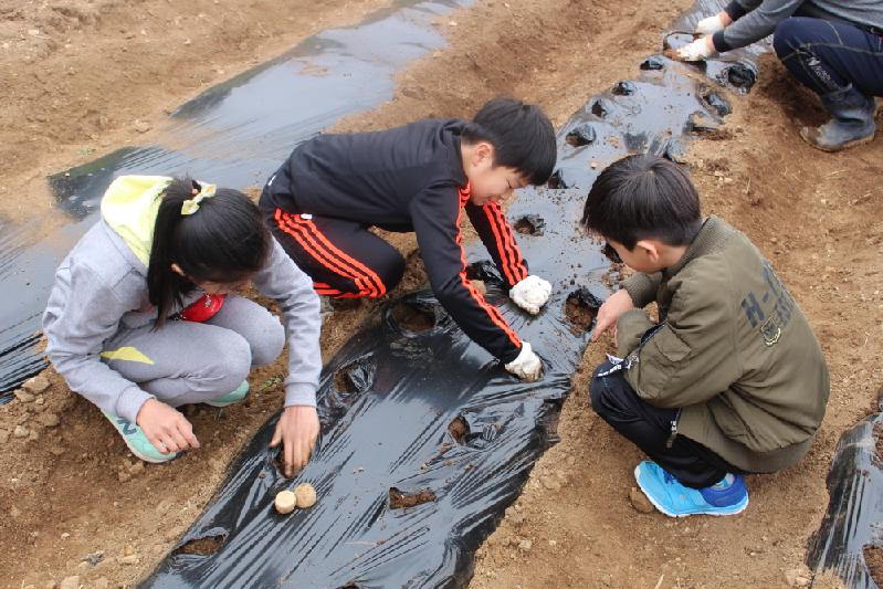 텃밭체험 학습장에서 황건수 교감은 감자를 어떻게 심는지 직접 시범을 보여 주면서 학생들에게 도시 농부 체험을 할 수 있는 기회를 제공하였다. 학생들은 직접 이랑을 만들고 비닐을 덮어 씨감자를 심었다.