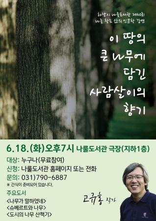 하남시 나룰도서관은 오는 18일 오후 7시 나눌도서관 도서관극장에서 ‘이 땅의 큰 나무에 담긴 사람살이의 향기’라는 주제로 제40회 나를 찾는 삶의 인문학 강연을 개최한다.