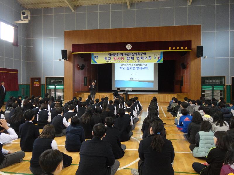 불국중학교(교장 정성득)는 2016년 4월 6일(수) 오후 1시부터 한국원자력안전기술원의 협조아래 전교생 및 교직원을 대상으로 한 방사능 방재교육을 받았다. 이번 교육은 일본 원전사고 및 노후 원전 불안감 등으로 인한 방사능 방재교육의 중요성이 관심사항으로 대두됨에 따라 청소년들의 자율 방재 능력을 배양하고자 실시되었다. 교육은 원자력 발전소의 기초, 방사선 관련 용어, 방사선 비상의 정의 및 종류, 원전 비상시 주민 행동요령, 비상시 집결지, 비상시 구호소, 구호소 대피 시 행동요령, 구호소에서의 행동요령 등의 내용으로 진행되었다. 불국중학교 정성득 교장은 “이번 교육을 통하여 학생들이 방사선 비상시 행동요령 및 비상시 집결지 등에 대해 잘 숙지할 수 있는 기회가 되었고, 학생뿐만 아니라 교직원들에게도 원자력 발전소에 대한 막연한 불안감을 감소시킬 수 있어 의미 있는 시간이었다.” 고 전했다. // 김희철 기자 khc4236@hanmail.net