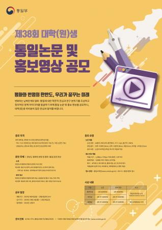 통일부는 전국 대학생 및 대학원생들이 변화하는 남북관계와 평화·통일에 대해 진지하게 고민할 수 있는 기회를 제공하고 평화통일을 위한 참신한 정책을 발굴하고자 14일부터 오는 10월 8일까지 ‘제38회 대학생 통일 논문 및 홍보 영상 공모’를 실시한다.