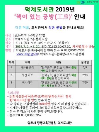 양주시 덕계도서관은 오는 7월 6일부터 20일까지 매주 토요일 총 3회에 걸쳐 ‘책이 있는 공방’을 운영한다.