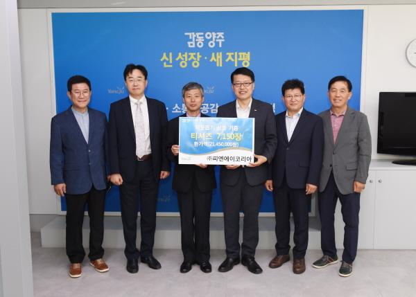 양주시는 ㈜피엔에이코리아에서 지난 13일 양주시청을 방문해 관내 어려운 이웃을 돕는데 써달라며 티셔츠 7,150장을 전달했다고 밝혔다.
