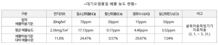 포항 SRF시설은 대기오염물질 배출을 최소화하기 위해 6단계의 방지시설을 운영 중이며, 2019년 3월부터 5월 말까지 약 3개월 동안 대기오염물질 일평균 배출농도는 대기환경보전법 제16조 규정의 배출허용기준 대비 먼지는 11.8%, 질소산화물은 24.47%, 황산화물 0.57%, 염화수소 29.87%, 일산화탄소 7.04% 수준에서 배출하고 있다.