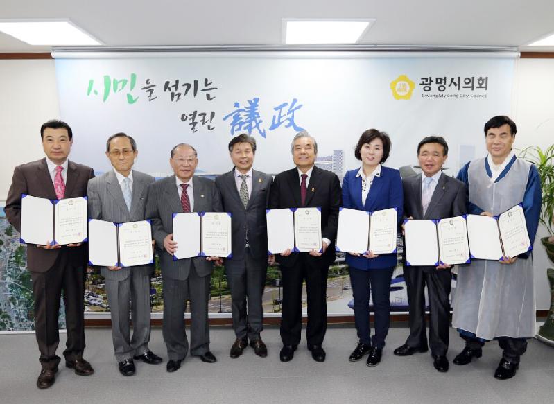 | 8일 나상성 의장과 광명시의회 의원 행동강령자문위원으로 위촉된 위원들과 기념사진을 찍고 있다. |