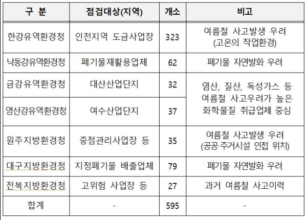 점검대상 사업장은 자연발화 등의 이유로 여름철 사고발생 위험도가 높은 도금 사업장이나 지정폐기물 배출업체, 독성 화학물질 취급 업체, 과거에 화학사고가 발생했던 업체 등이다.