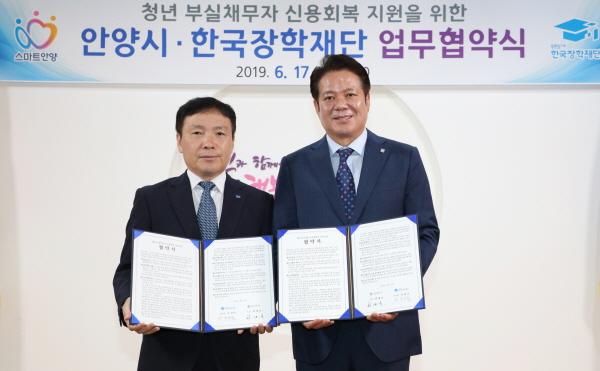 최대호 시장과 이정우 한국장학재단 이사장이 17일 안양시청에서 청년 부실채무자 신용회복을 위한 업무협약을 맺었다.