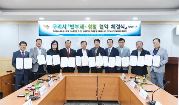 구리시는 17일 소통공보담당관 소관 9개 유관단체장들과 지역사회 청렴문화 확산과 신뢰받는 공직사회 조성을 위한 ‘반부패·청렴실천 협약’을 체결했다.