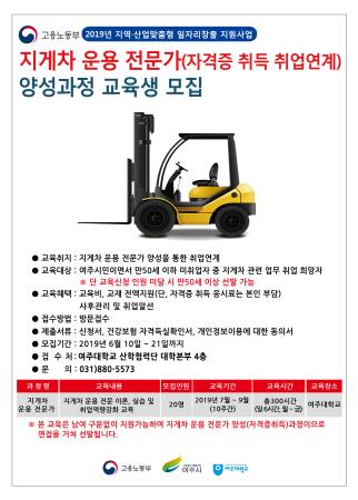 2019년 지역 · 산업맞춤형 일자리창출 지원사업으로 추진하는 “지게차 운용 전문가 양성과정”은 여주시와 여주대학교 산학협력단이 협업해 오는 7월부터 9월까지 총300시간 수업으로 운영된다.