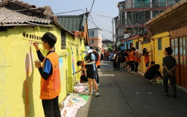사)동두천시종합자원봉사센터는 지난 15일 8시 제15기 한마음 가족봉사단과 동두천여자중학교 미술동아리 학생 등 100여 명이 중앙동 6통 골목에 ‘추억의 만화골목’이라는 주제로 벽화 색칠작업을 실시했다.