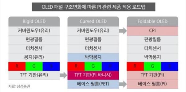 폴더블 폰은 접었다 펴야하는 특성상 커버윈도우, TFT 기판, 베이스 필름 모두에 새로운 소재가 필요하다. 투명 PI 필름은 타 소재 대비 우수한 기계적, 전기적 및 화학적 물성을 지녔기 때문에 유리의 대체재로 불리운다. 따라서 수십만 번을 접었다가 펴도 흠집이 나지 않고 가볍고 유연하기 때문에 스마트폰은 물론이고 노트북 등에 얼마든지 적용할 수 있다.