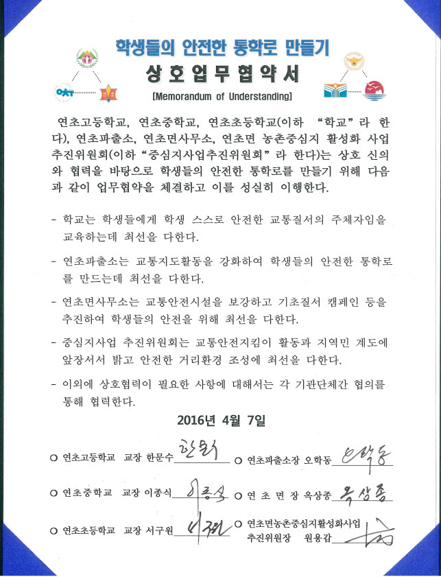 거제시 연초면 중심지 활성화 사업 추진위원회(위원장 원용갑)는 안전한 죽토삼거리를 만들기 위해 지난 7일 11시, 연초면사무소에서 민․관․학 관계기관단체장과 협약을 체결했다.