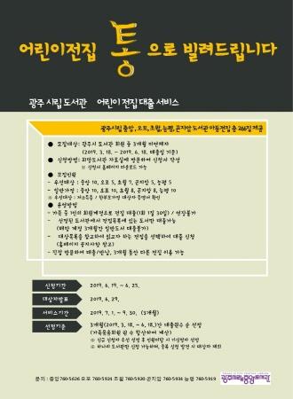 광주시 시립중앙도서관은 어린이 전집을 한 달간 대출해 주는 ‘어린이 전집 대출서비스’ 참여자를 모집한다고 18일 밝혔다.