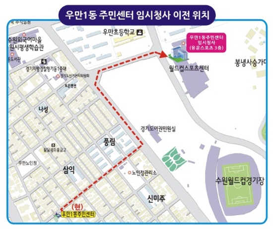 수원시 팔달구 우만1동주민센터(동장 김재섭)는 기존청사 부지 내에 동청사를 신축함에 따라 공사 기간동안 임시청사로 이전할 예정이다.