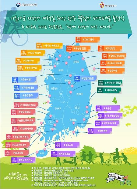 문화체육관광부와 한국관광공사는 자전거 여행 문화 확산을 통한 지역관광 활성화를 위해 오는 22일 부터 11월 23일까지 5개월 동안 ‘아름다운 자전거 여행길‘ 30선 완주 챌린지 페스티벌’을 개최하며, 22일 10시, 서울 광나루 자전거공원에서 그 대장정을 시작하는 출정식 행사를 갖는다.