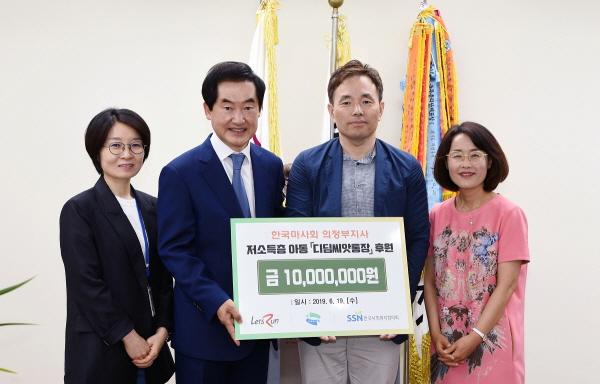 의정부시는 19일 안병용 의정부시장, 한국마사회 의정부지사 진귀환 지사장 및 관계자가 참석한 가운데 의정부 관내 저소득층 아동들을 위한 디딤씨앗통장 후원금 1000만원 전달식을 가졌다.