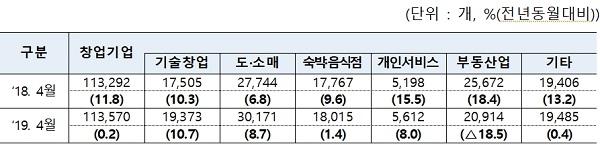 부동산업의 경우 창업이 안정화되며 지난해 4월에 비해 18.5% 줄어 들었으나, 양질의 기술창업 과 전통서비스업 창업이 고루 늘면서 전체 창업기업 수의 증가를 이끌었다.