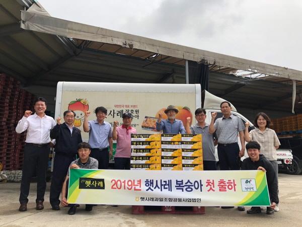 햇사레과일조합공동사업법인는 19일 햇사레 참여 농협인 경기동부과수농협 조합원 박재일씨가 재배한 ‘설향로’ 3kg 20상자와 장호원농협 조합원 강구용씨가 재배한 ‘초극황도’ 3kg 15상자의 첫 출하식을 경기동부과수농협 이천지소에서 열었다.